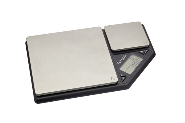 Dos juegos de básculas. Hay una gran plataforma para pesar grandes cantidades de ingredientes secos y líquidos en general – hasta 5 kilogramos o 5 litros. También hay un pequeño juego de básculas de precisión, diseñadas para medir pequeñas cantidades.